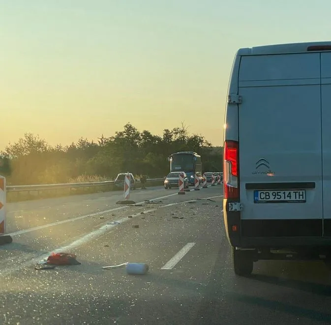 Машината се е забила в мантинелата на лентата за насрещно придвижване. По платното към морския град има разпилени счупени елементи.