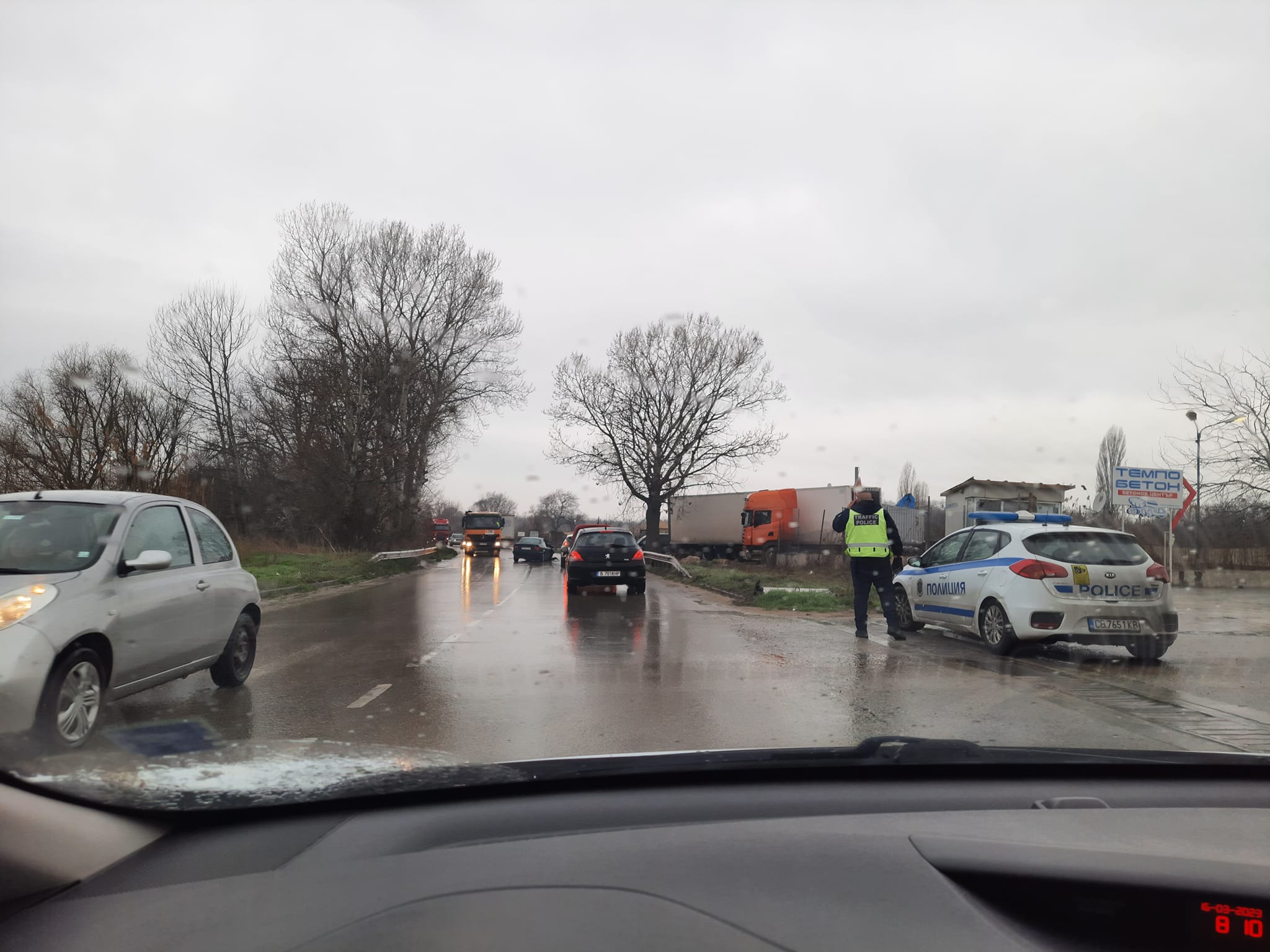 Катастрофиралата кола е на пътното платно, а трафикът се отбива през Тополи, оповестяват пътуващи. Образува се запушване.