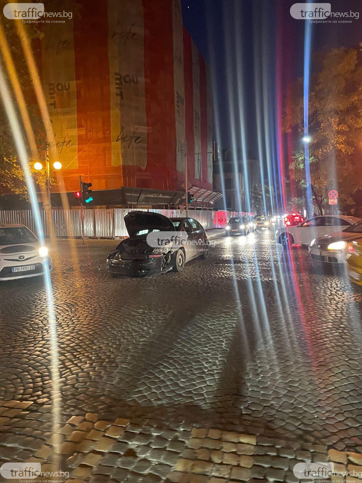 Катастрофа е станала в час пик на кръстовището на ул. " Авксентий Велешки " с ул. „ Иван Вазов ”. На мястото обаче има единствено един автомобил, на който в резултат на удар предницата му е смачкана.