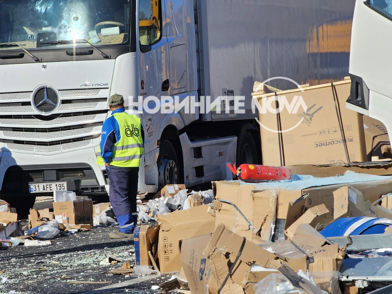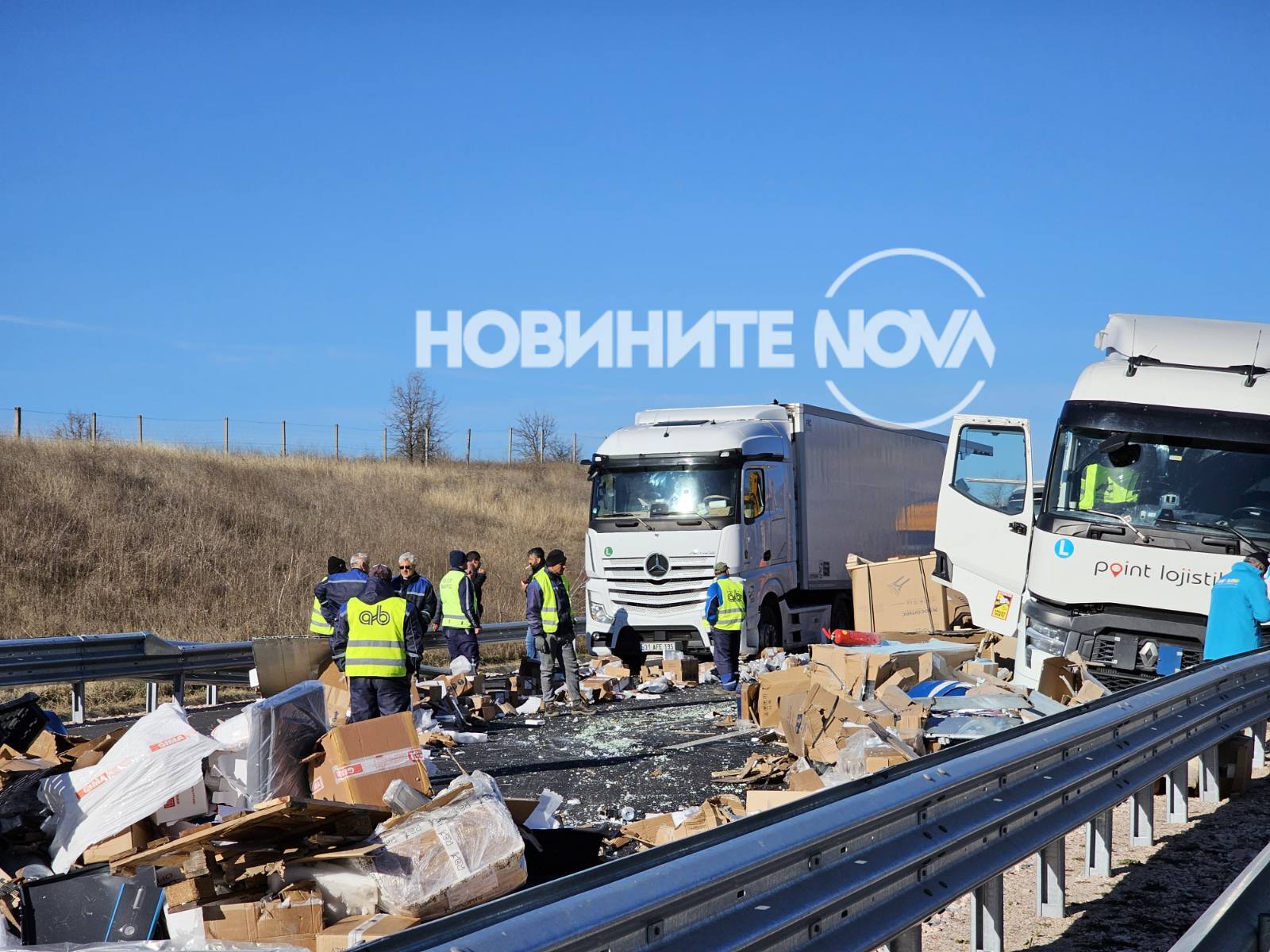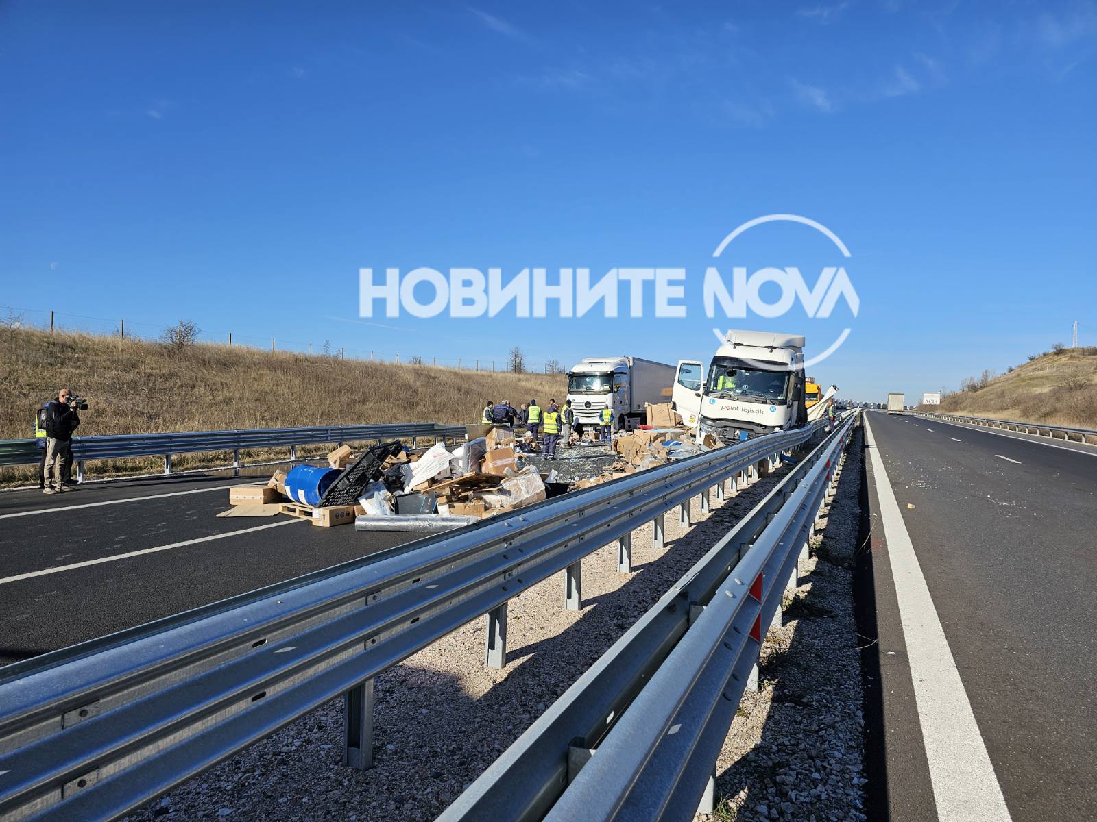 Инцидентът е станал към 4 часа. При удара сред двата тира се е разпилял товар, който би трябвало да бъде измит.