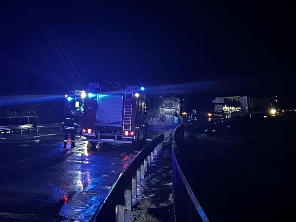 Горящият тир е изгасен и евентуално в сряда(19 април) със специфична техника изпепелените влекач и ремарке ще бъдат изтеглени от мястото на случая.