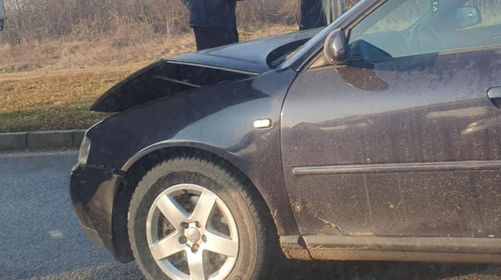Машините са спрени на пътното платно, а останалите участници в придвижването ги заобикалят. Леката кола е с изкривена предна част.