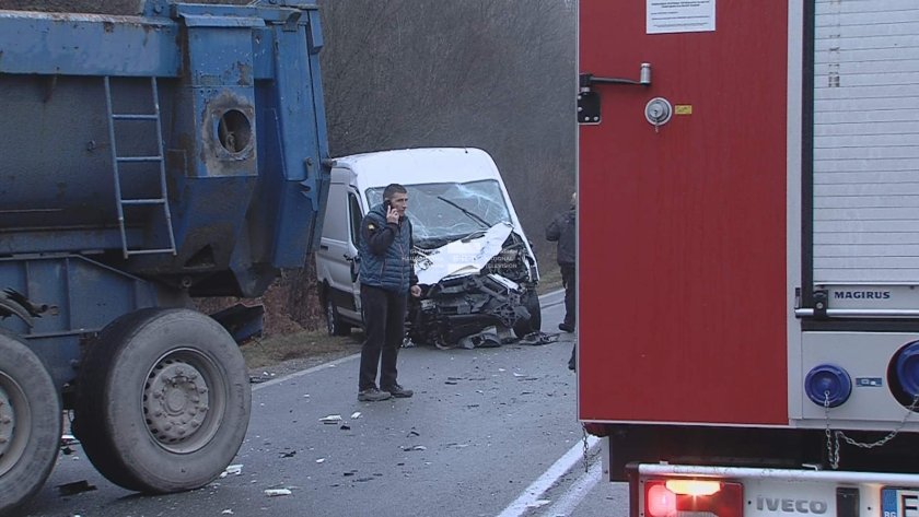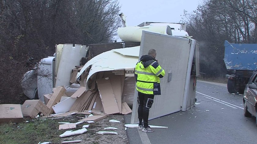 По първична информация тежкотоварният камион е направил маневра, с цел да се отклони надясно, когато в него се е блъснал микробус. За благополучие няма съществено потърпевши.
