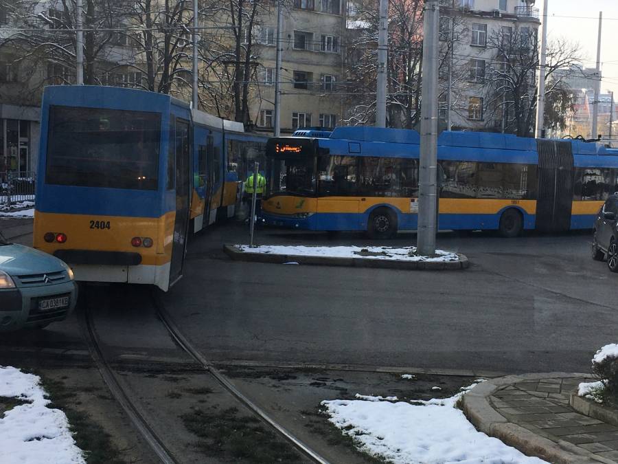 Катастрофа сред трамвай номер 5 и лек автомобил блокира кръговото кръстовището на Руски монумент в София, заяви БГНЕС.