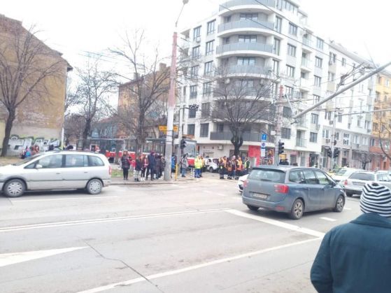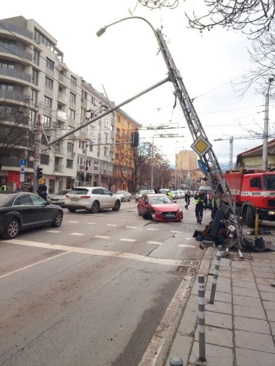 Блъснат е уличен дирек на кръстовището. Той е огънат над жиците на електротранспорта. На място са спешни екипи.
