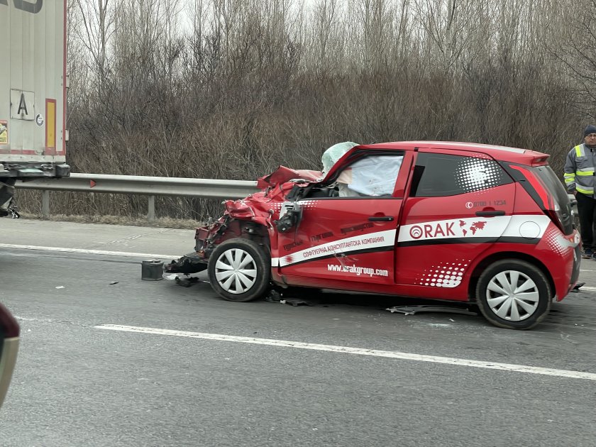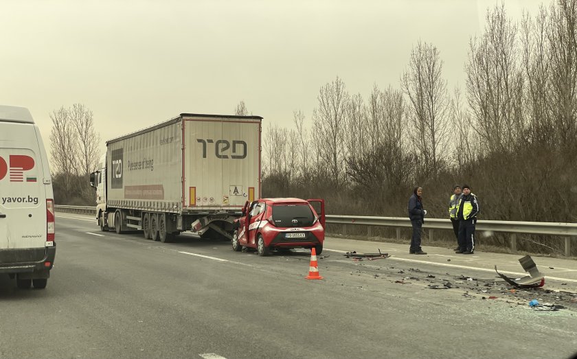 Фирмен лек автомобил " Тойота " с пловдивска регистрация се е блъснал в задната част на тежкотоварен камион.