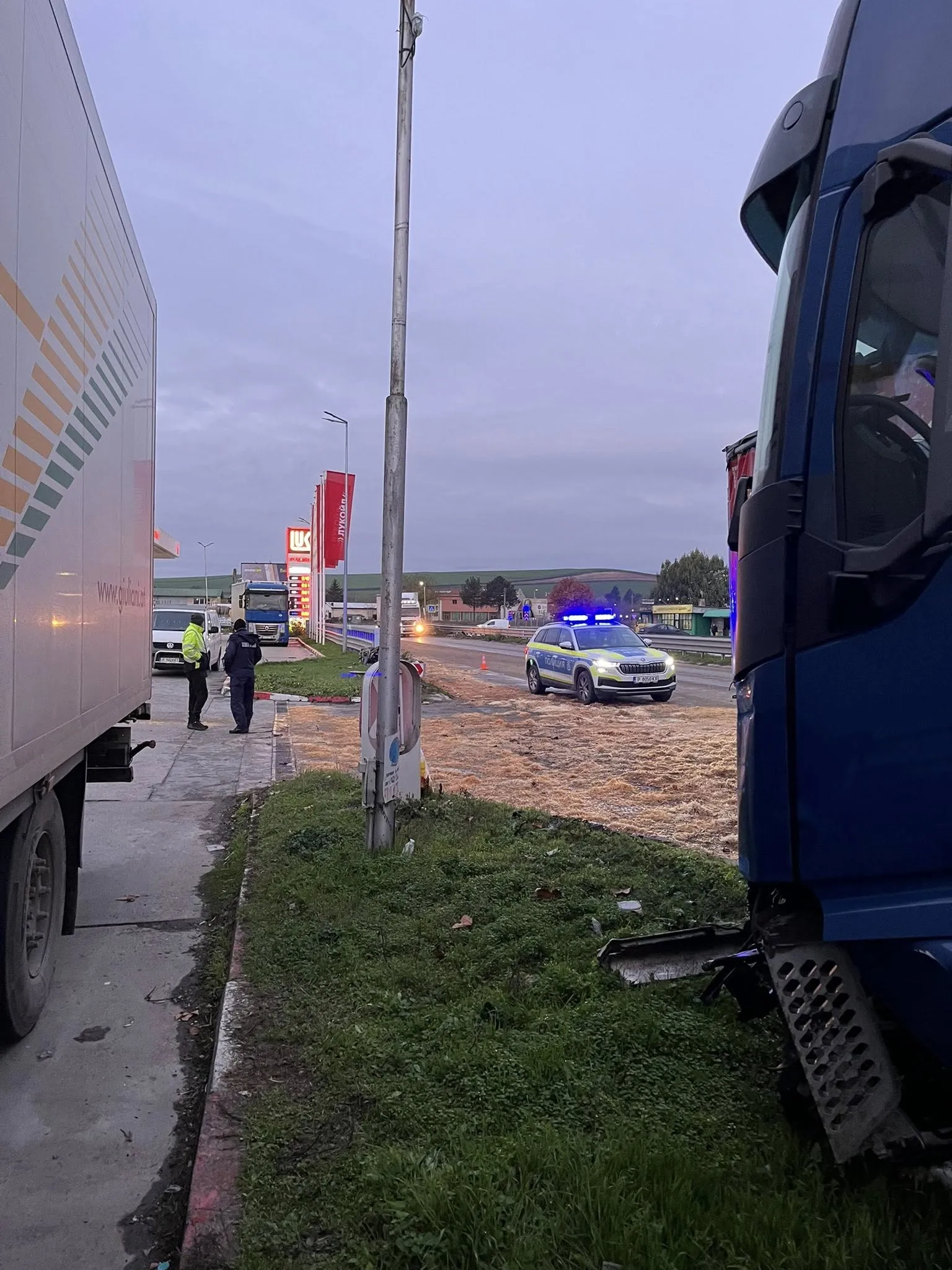 Тежкотоварното возило е аварирало до бензиностанция " Лукойл " в град Бяла.