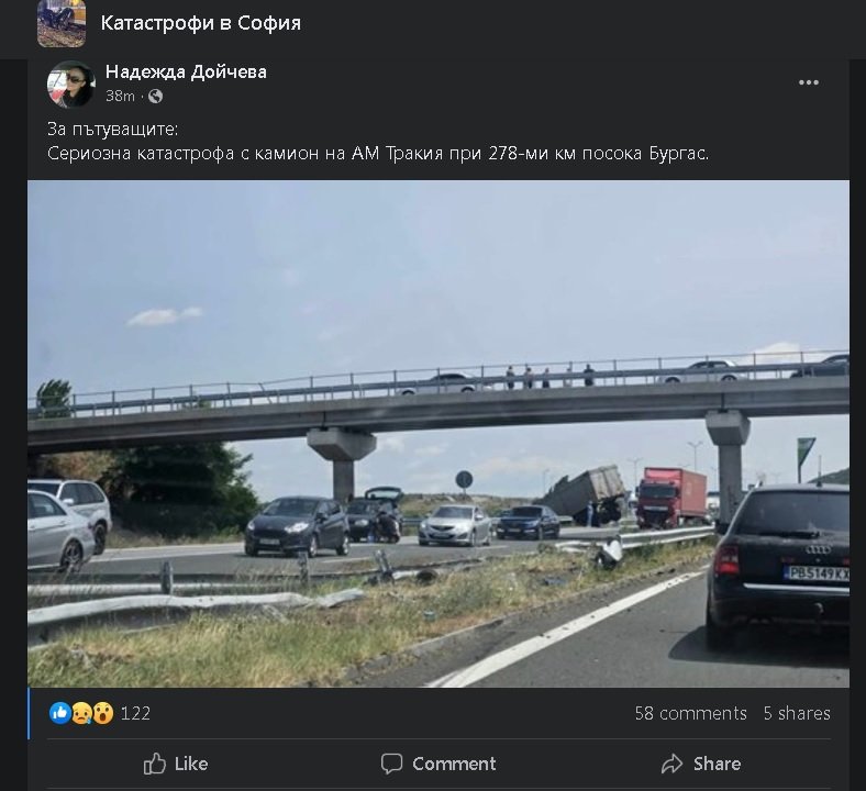 Катастрофа с камион затруднява придвижването по автомагистрала " Тракия " при 278-ия км в посока Бургас, край село Дражево.