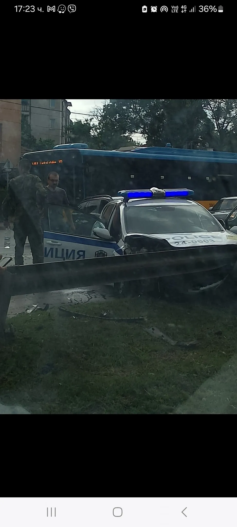 Според свидетел, юноша с черен автомобил прави противоположен завой на двойка непресечена линия и удря полицейския автомобил челно. Патрулката е била с включен светлинен сигнал.