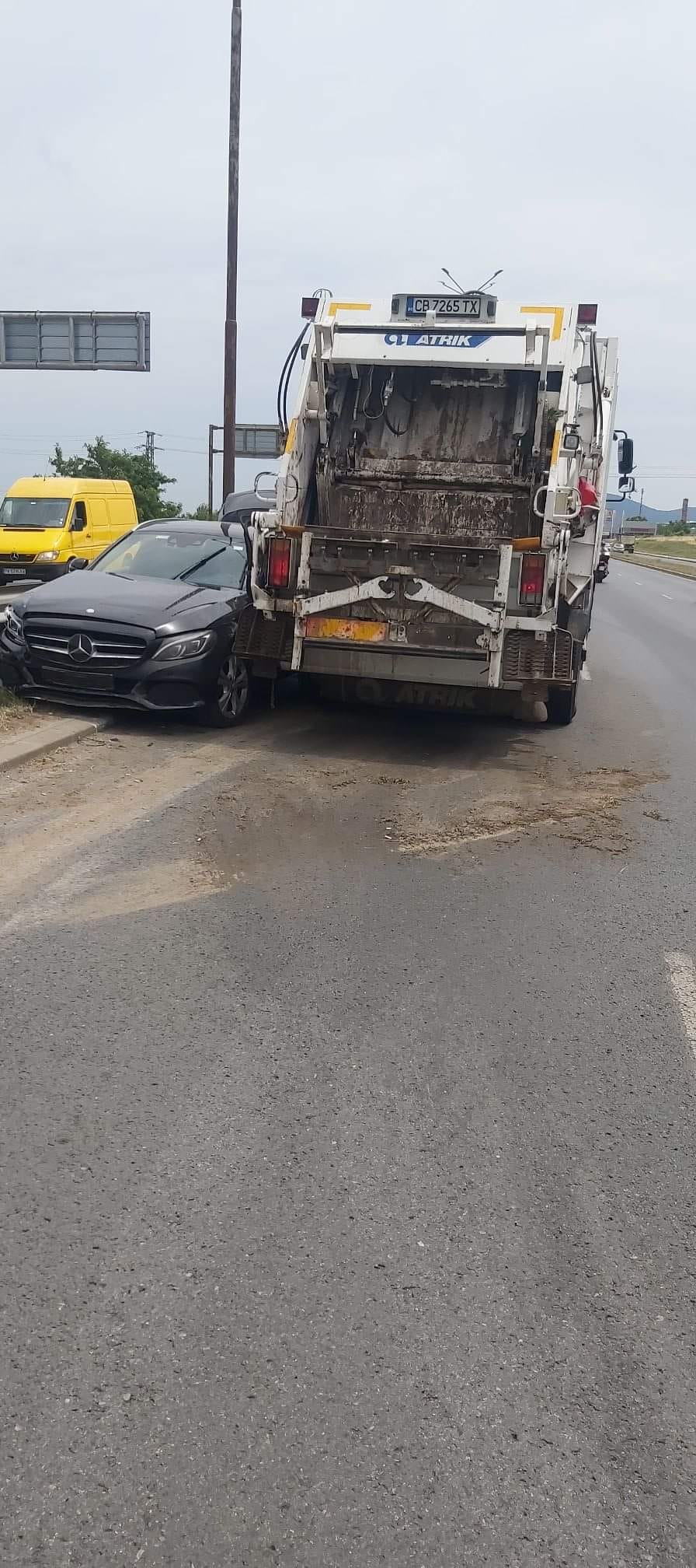 Автомобил с марка „ Мерцедес “ и камион за сметосъбиране са се блъснали. От удара леката кола е затисната от тежкотоварното транспортно средство.