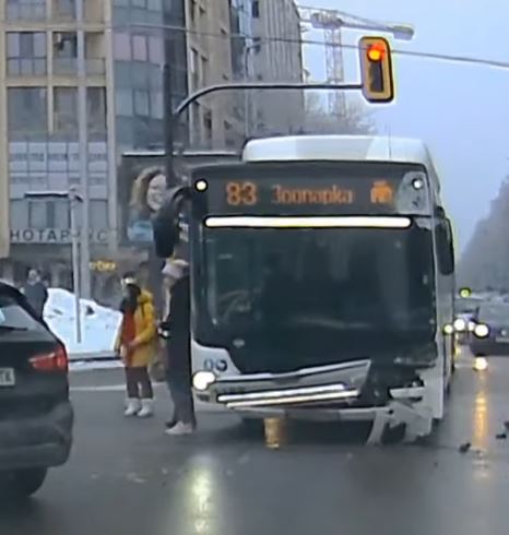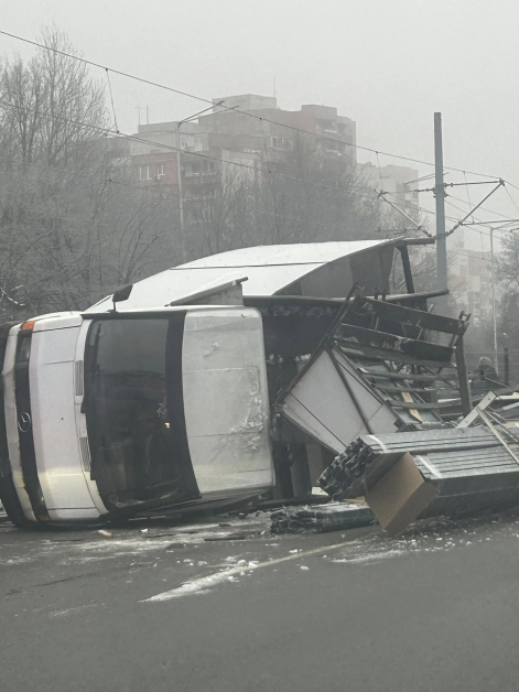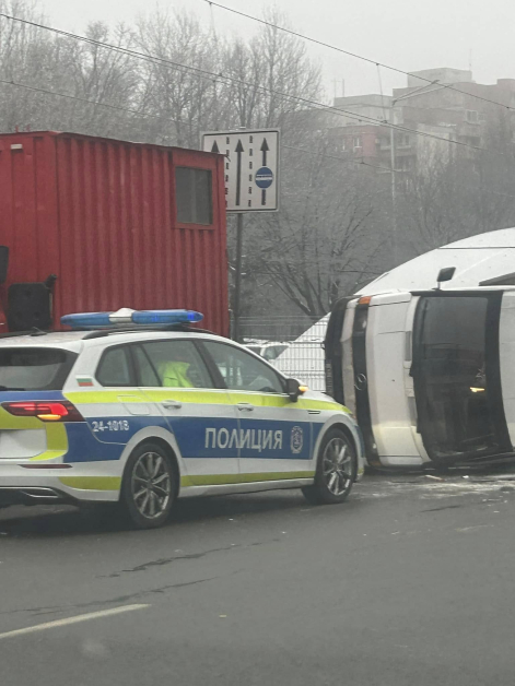 Катастрофа стана преди минути в София. Рейс от градския превоз и бус са се блъснали на бул. „ България “ и „ Гоце Делчев “, в посока центъра. От удара бусът се е обърнал на пътното платно.