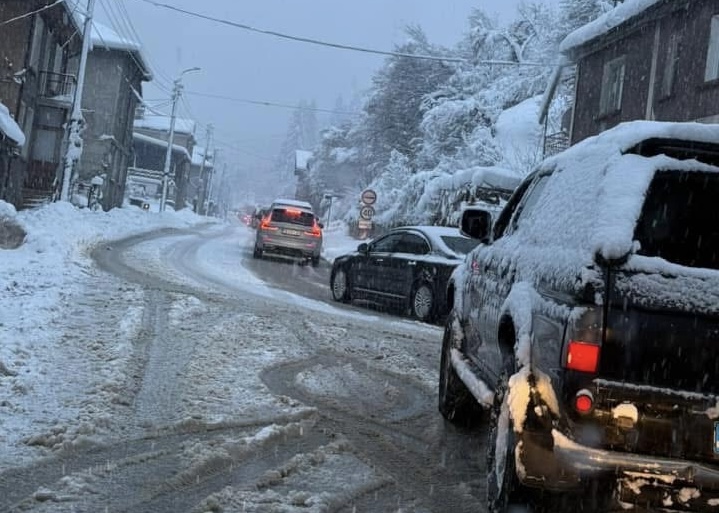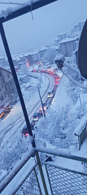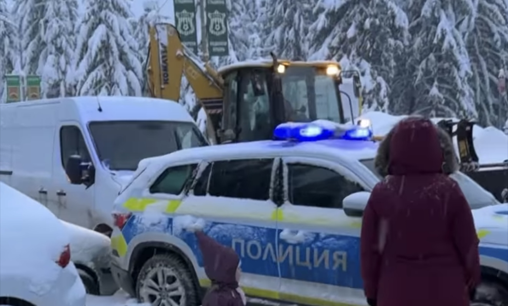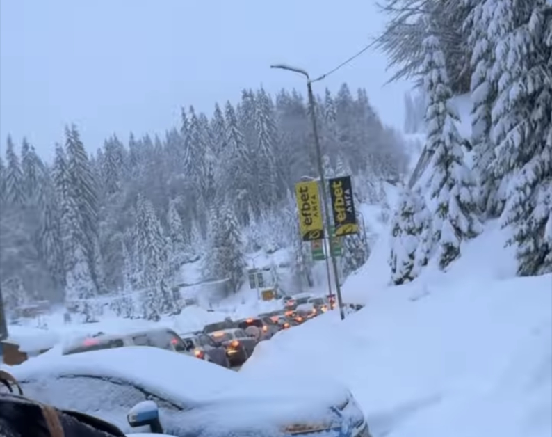 Заради случая, пътят за Пампорово и Смолян е блокиран от дълги колони коли. Десетки водачи са заседнали в задръстването, до момента в който снегът продължава да утежнява изискванията.