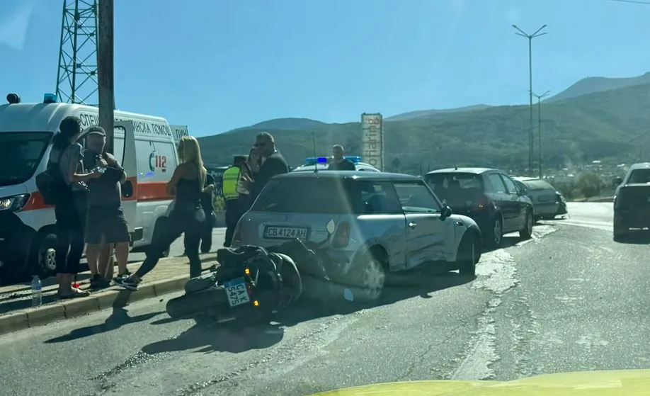 Моторът е паднал на земята, а по един от леките коли има следи от удар. Пристигнали са медици и чиновници на реда. Граждани настояват, че мотористът е качен в колата за спешна помощ.