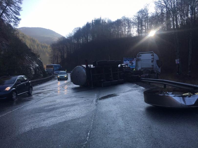 Цистерна с вода се обърна по пътя за Банско