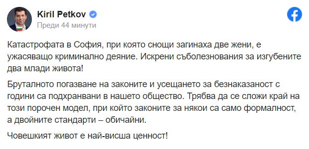 Катастрофата в София, при която нощес починаха две дами, е ужасяващо престъпно действие. Искрени съболезнования за изгубените два млади живота! Това написа във „ Facebook “ министър председателят в оставка Кирил Петков.