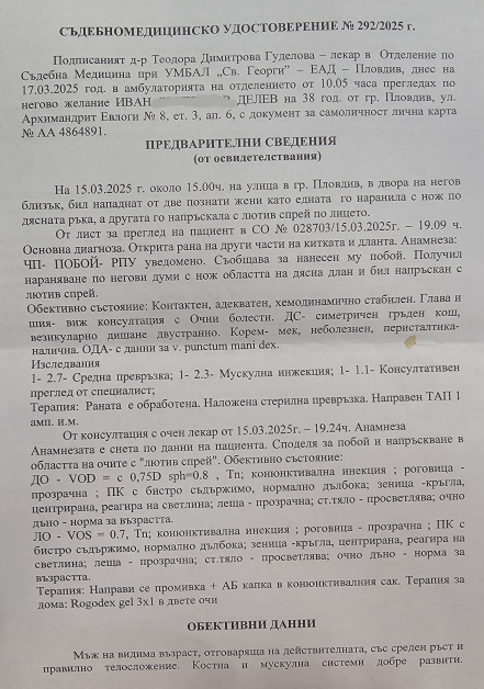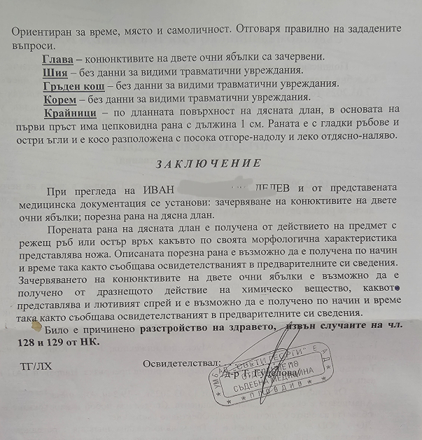 „ На 15 март, към обяд се прибра щерка ми, очевидно смутена. Разказа ми, че се е засякла с Виктория Златанска. Последната си изтръскала цигарата върху главата й и надрала ръката й. Успокоих детето, само че до момента в който течеше нашият диалог, видях въпросното момиче и майка й – Милка. Двете влязоха в двора на Христеви. Започна скандал сред двете дами и възрастните. По едно време видях, че нещата ескалират и стартират да постановат с ръце Христеви. Скочих и се намесих, не съм ги докосвал, единствено извиках да спрат, че ще повикам полиция. В този миг Милка извади от чантата си нож и посегна към мен. Аз подвигнах ръка и тя ме прободе в дланта. В това време щерка й Виктория извади пикантен спрей и ме напръска в лицето. Избягах към моя двор, отидох незабавно да мия очите си. След 5 минути пристигна полиция, видях, че идва и кола за спешна помощ.