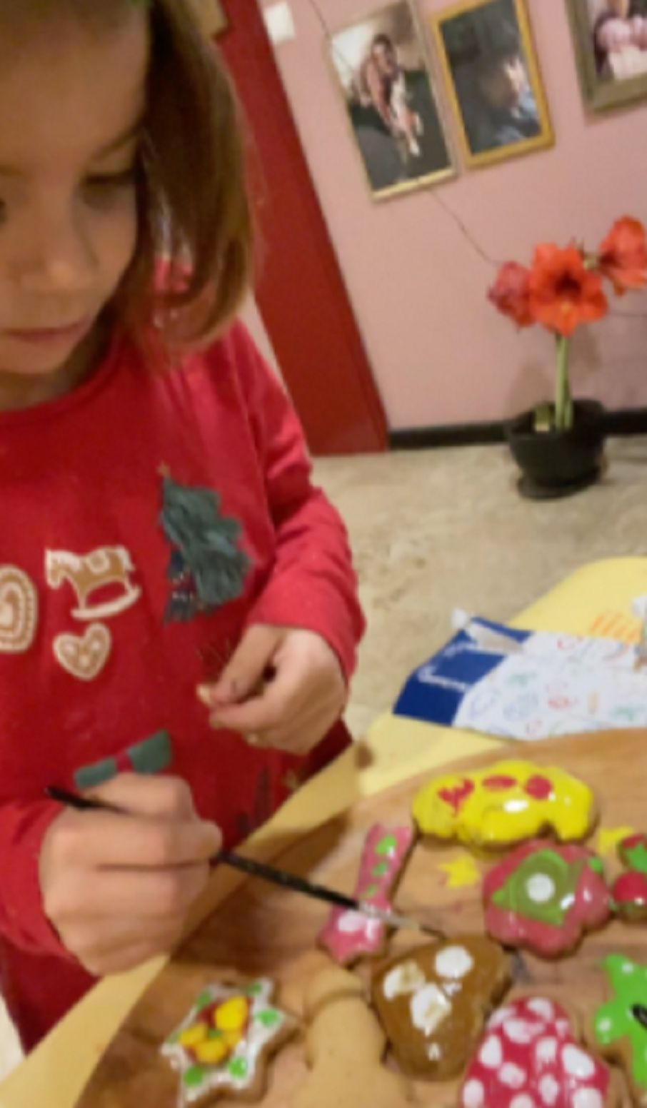 “Какво викаш? Коледни сладки на 30 ноември? Добре, щом те влече. Много красиви ги правиш, Кати, отлично! Много си добра! Това ни е подготовка за коледните сладки, нали?”, разяснява Катето, до момента в който детето рисува върху курабийките, изрязани в разнообразни форми.