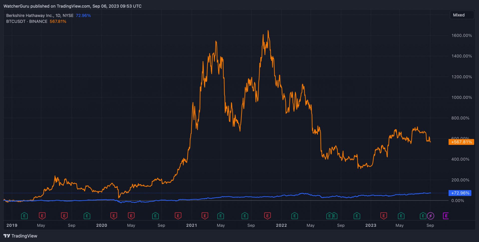 Биткойн е прочут с високата си волатилност, като постоянно изпитва обилни съмнения в цената. Понастоящем той се търгува много под пиковата си стойност от $69,000. Въпреки това, когато се преглеждат от макро вероятност, облагите на Биткойн се открояват. От 2019 година насам Биткойн е поскъпнал с впечатляващите 567%. За разлика от тях акциите на Berkshire Hathaway са отбелязали растеж от едвам 72.96%.