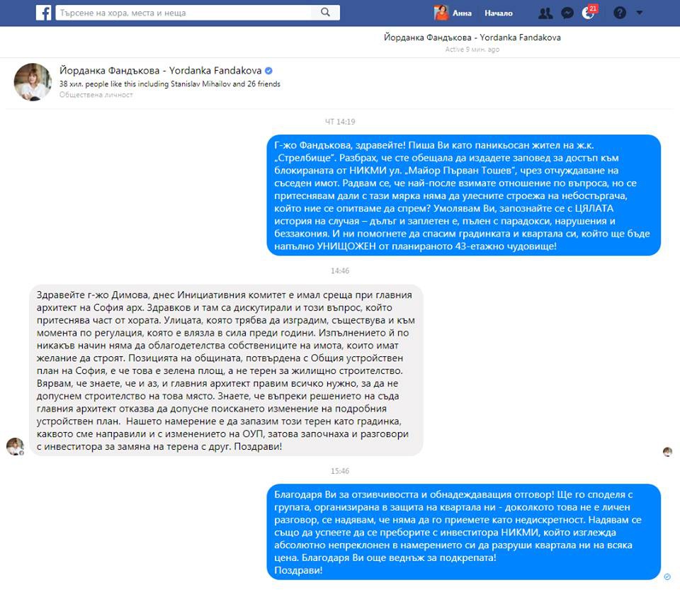Днес, 11 август, представители на Инициативния комитет за Стрелбище са имали среща с основния проектант на Столична община Здравко Здравков, твърди кметицата на София Йорданка Фандъкова. Тя също за следващ път сподели, че " ".