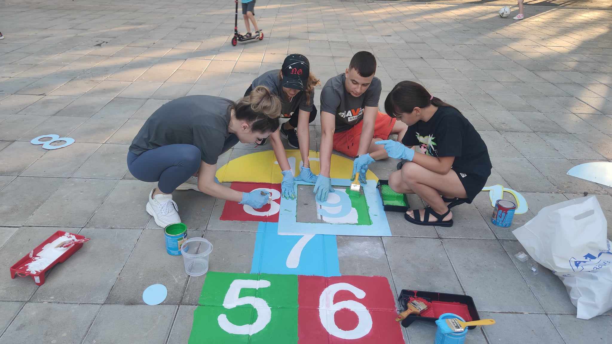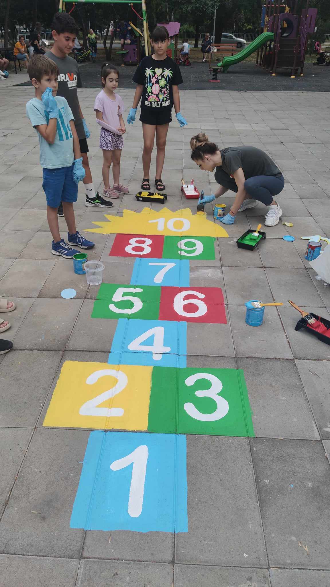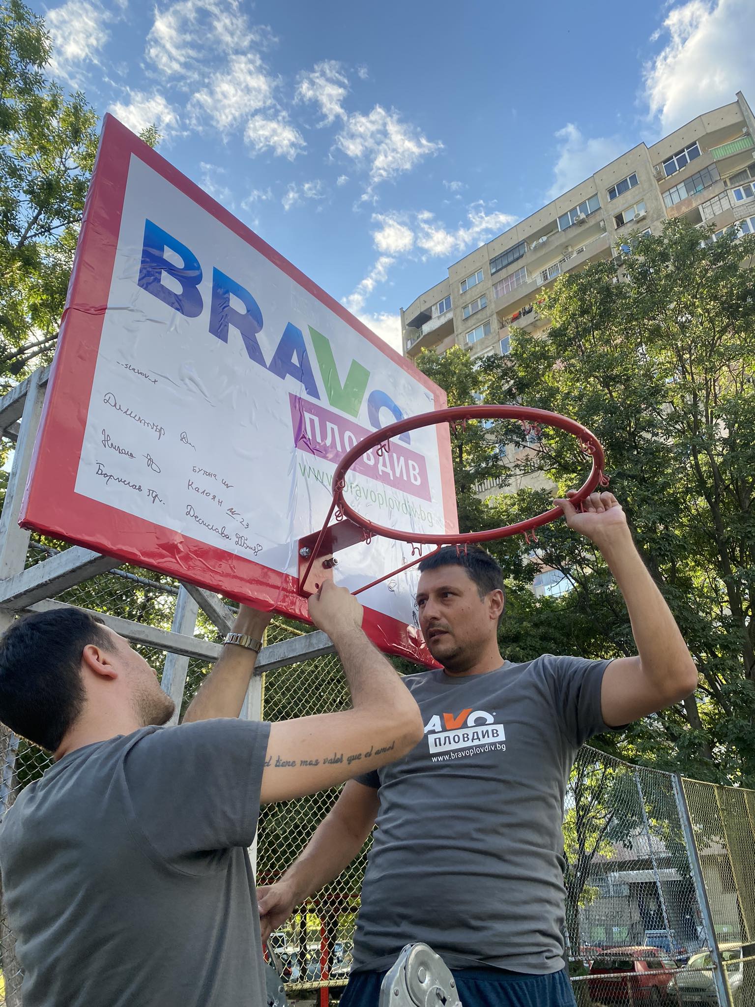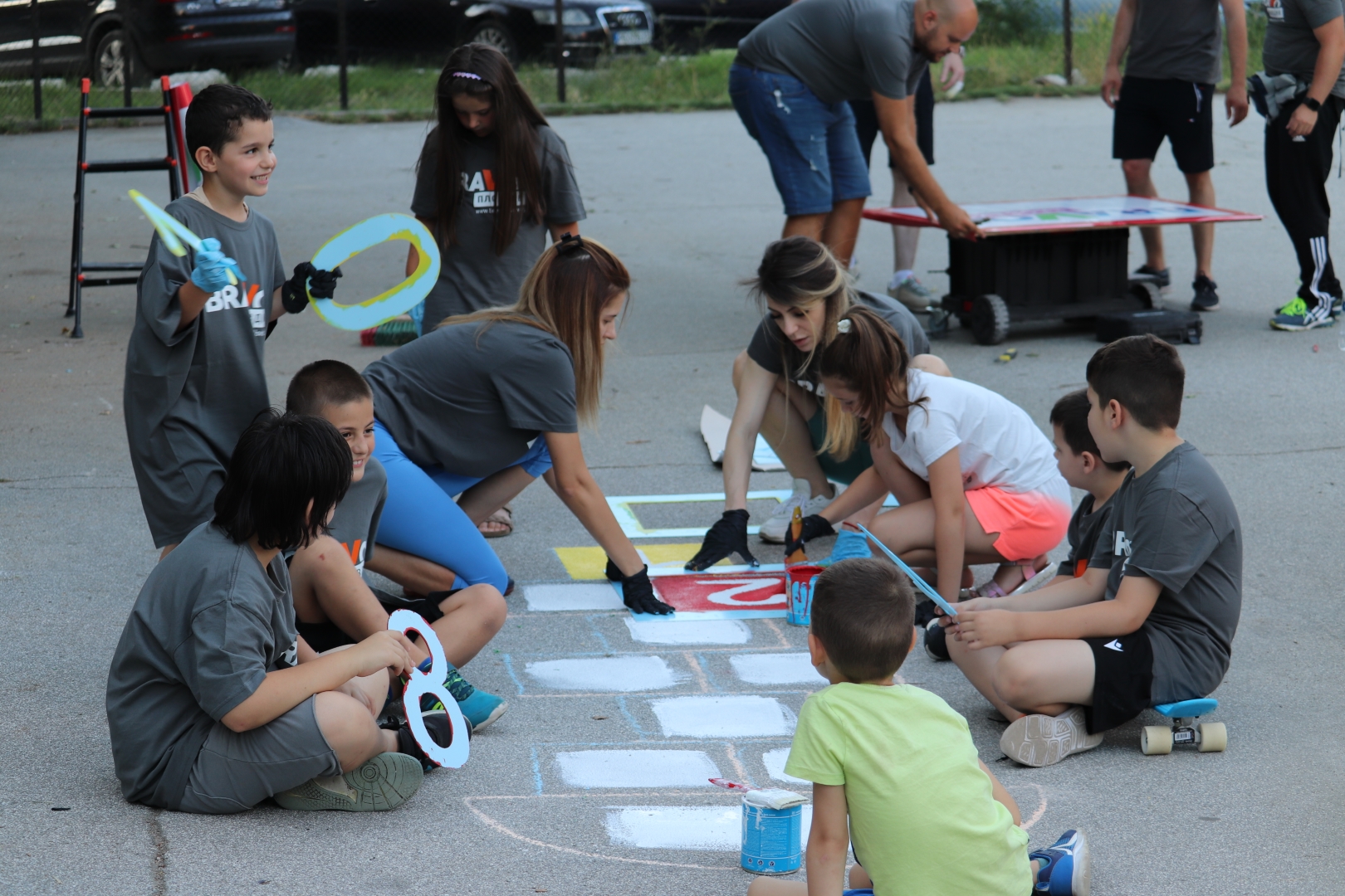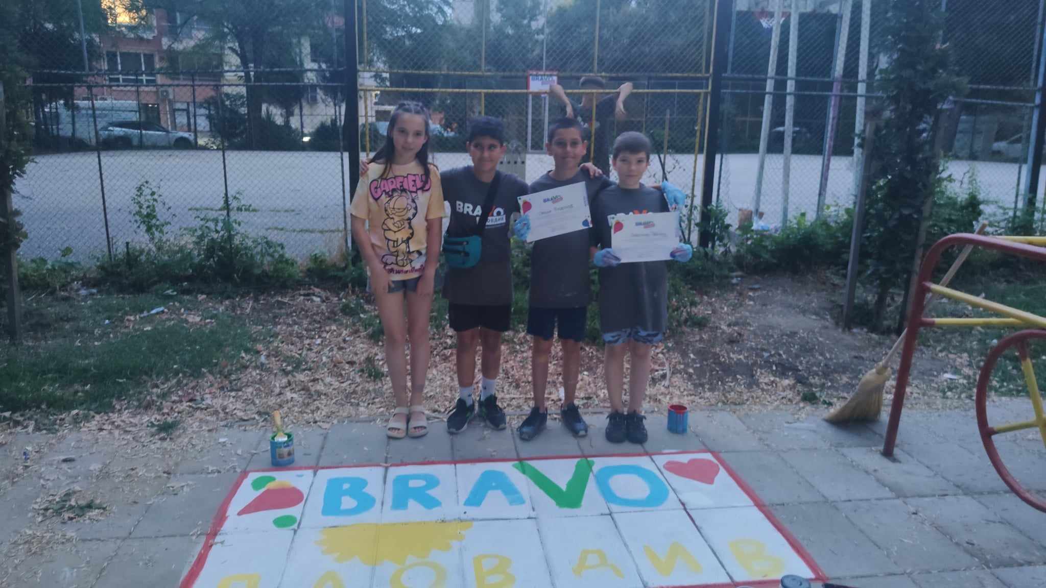 Момчетата, които нямаха самообладание, да тестват новите порти, първи сграбчиха метлите, с цел да съберат шумата и отпадъците от игрището. А по-късно помогнаха на батковците да инсталират новите кръгове на баскетболните кошове. На метри от площадката, по-малките девойки и момчета нямаха самообладание да нарисуват цветна дама. Бързо реализираха единодушие, кой коя цифра ще оцветява. Не останаха по- обратно и част от родителите, които предизвикани от ентусиазма на децата си, също сграбчиха четките и метлите.