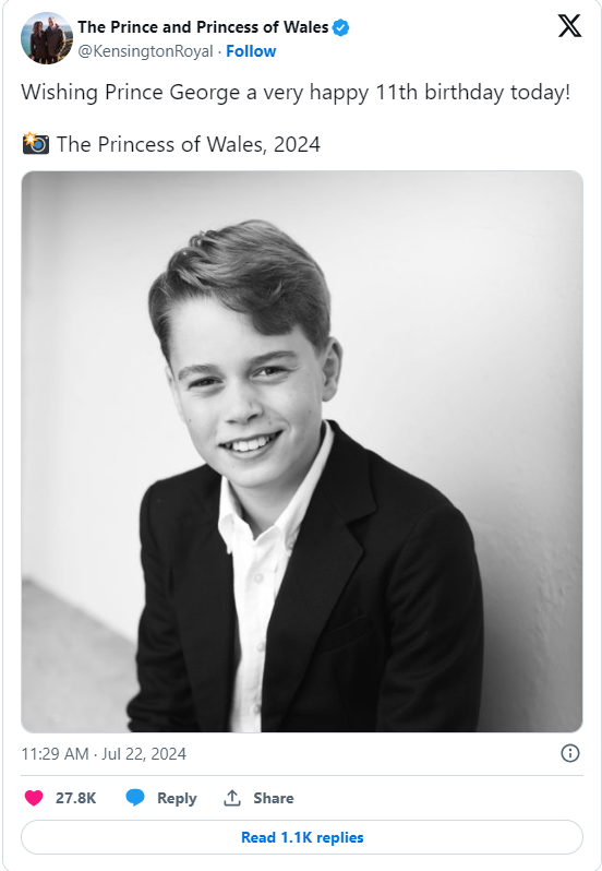 Кейт Мидълтън и принц Уилям споделиха нова фотография на сина си принц Джордж по случай 11-ия му рожден ден в понеделник.