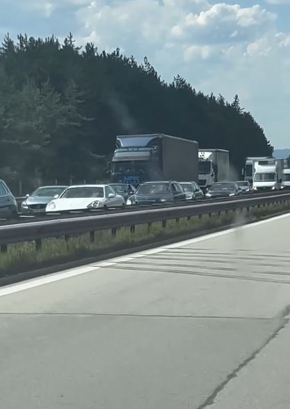 Километрична опашка се е образувала на Автомагистрала „ Тракия “ в този миг. Дълги минимум 7 километра колони от коли и камиони са блокирани в посока Пловдив от отбивката за Костенец, от двете страни на „ Траянови врата “.