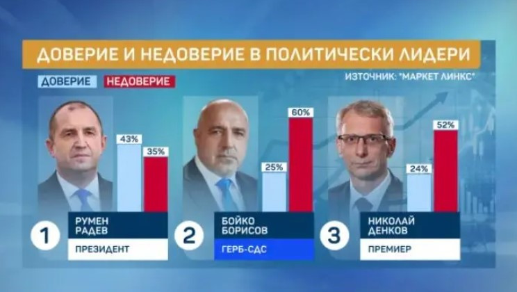 Според изследването, Бойко Борисов е с по-високо доверие от това на премиера Николай Денков. 25 на 100 имат вяра повече на водача на ГЕРБ в сравнение с министър-председателя.