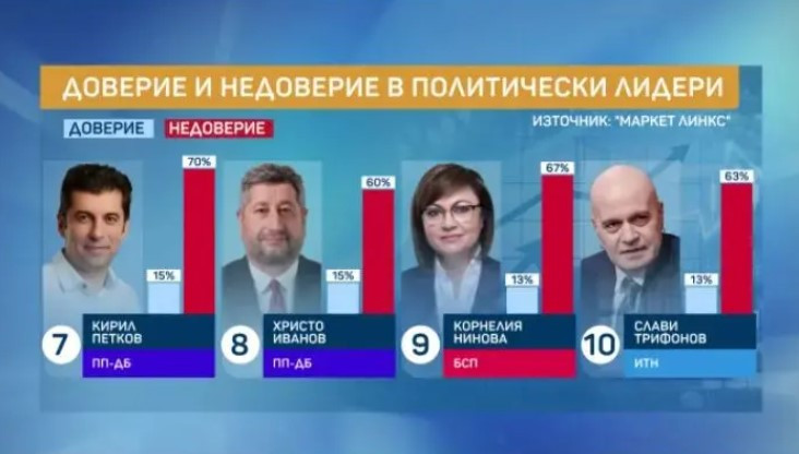 Сериозно е недоверието към водачите на ПП-ДБ. На Кирил Петков нямат доверие 70% от интервюираните лица. Одобряват го колкото да 15 на 100. Финансовият министър Асен Василев също не се радва на изключително утвърждение. 64 на 100 декларират, че му нямат доверие, а 16 на 100 биха му се доверили.