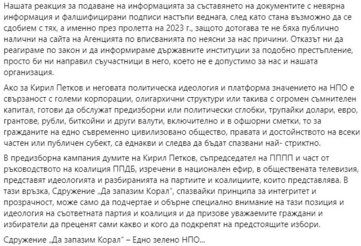 „ В частност, точно членуването на Кирил Петков в Сдружение „ Да запазим Корал “, беше единствената платформа и трамплин, от която стартира политическата му кариера. От това „ някакво зелено “ Неправителствени организации стартираха политическата си кариера и доста други представители на тази власт„ Да запазим Корал ” легитимира единствените цивилен позиции, които в миналото е заемал обществено бъдещият министър председател и политически водач на Политическа партия. Колкото и мъничко да е, това съдружие от дълго време отдръпна заема си на доверие към него и всички, които не помниха от кое място са тръгнали и най-много, с какви цели, планове и хрумвания. Оттеглихме доверието си от тези, който поради политическа власт, дивиденти и материални облаги, осребриха участието си в Сдружението „ Да запазим Корал “ и даже се трансфораха в противовес на тази концепция “, декларират още те.