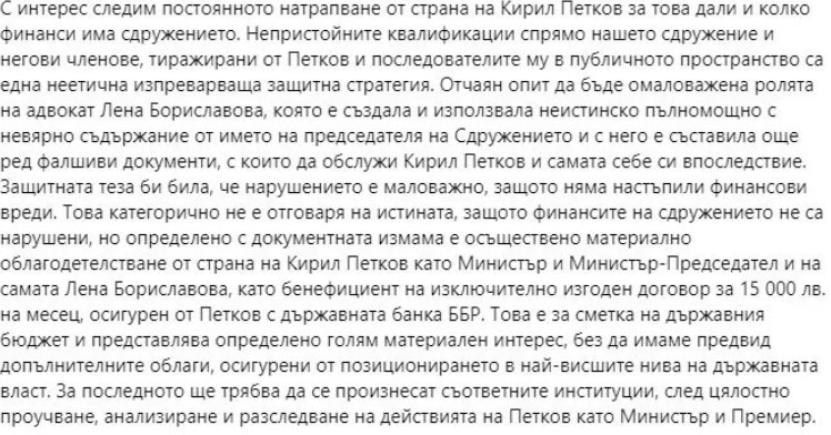 С интерес следим непрекъснатото натрапване от страна на Кирил Петков за това дали и какъв брой финанси има сдружението. Непристойните квалификации по отношение на нашето съдружие и негови членове, тиражирани от Петков и почитателите му в общественото пространство са една неетична изпреварваща защитна тактика. Отчаян опит да бъде омаловажена ролята на юрист Лена Бориславова, която е основала и употребила неистинско пълномощие с погрешно наличие от името на ръководителя на Сдружението и с него е съставила още ред подправени документи, с които да обслужи Кирил Петков и самата себе си след това.