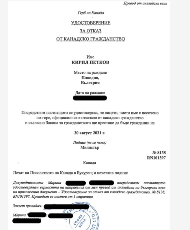 Кирил Петков не е канадец от 20 август 2021 година Това сочи документът, който удостоверява, че той към този момент не е двоен жител и е получил утвърждение на отхвърли си от гражданство от страна на Канада.