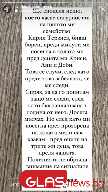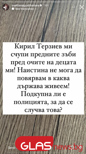 " Кирил Терзиев ми счупи предните зъби пред очите на децата ми!. Това заяви Светлана Гущерова късно нощес в профила си в Instagram. Красавицата твърди, че известният герой я пребил в колата й пред очите на три от децата й.