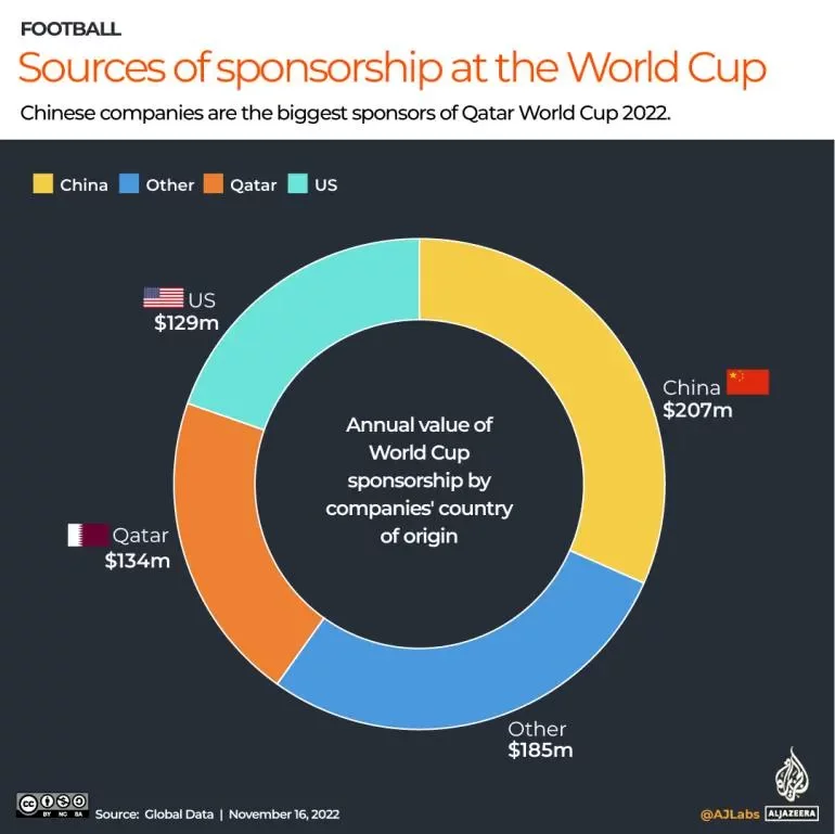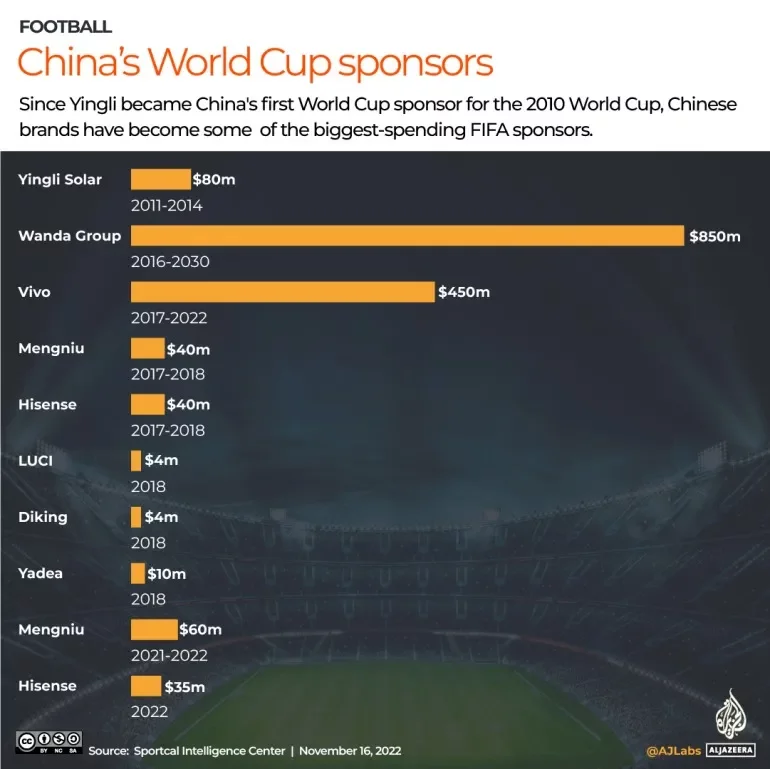 Най-големият китайски спонсор в Катар досега е Wanda Group, един от седемте публични сътрудници на ФИФА - най-високото равнище на спонсорство - дружно с Coca-Cola, Adidas, Hyundai, Kia, Qatar Airways, QatarEnergy и Visa.