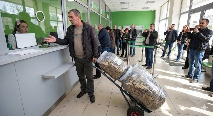 Снимката е генерирана с изкуствен интелект. Имало е обаче действителен случай на господин, който е донесъл за обмяна 3 бидона с монети
