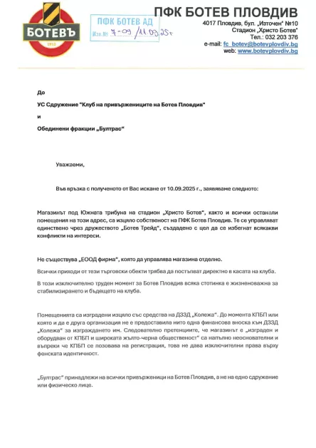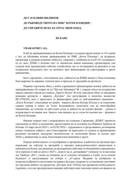 Клуб на последователите на Ботев Пловдив (КПБП) излезе с публична позиция, в която излага съществени нередности към ръководството на фенския магазин и потреблението на марката „ Bultras “. Според организацията, след напускането на досегашния чиновник Христо Илиев и предаването на ключовете на Илиян Филипов, са били подхванати дейности, които слагат под подозрение прозрачността и законността на стопанисването на обектите и приходите от тях. От КПБП настояват, че компанията „ Ботев Трейд “ ръководи магазини без контракт с общината и без изясненост къде отиват парите от закупените продукти, до момента в който в това време са регистрирани частни сдружения и марката „ Bultras “ на физическо лице.