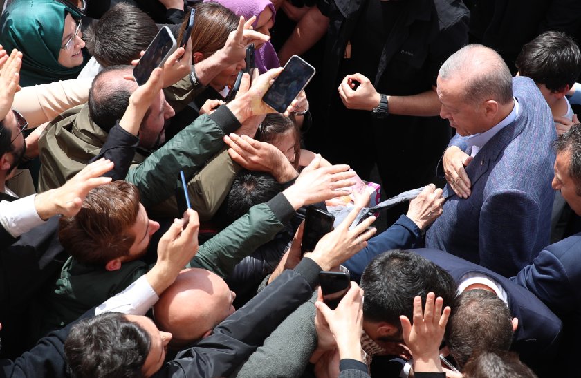 С възгласи " Реджеп Ердоган " и море от телефони последователите на президента го изпратиха от учебното заведение, в което гласоподава.