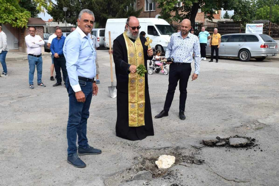 Отец Красимир благослови начинанието, след което Димитър Иванов сложи камък в основата на градежа, а кметът на Калековец Георги Вълков ритуално разруши шампанско в багера, който започва ремонта на пътния сектор.