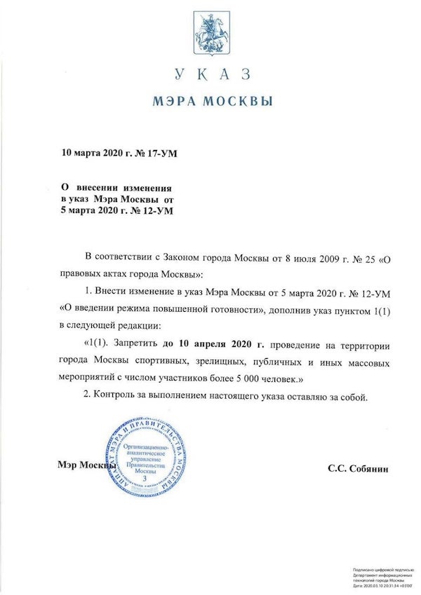 Кметът на Москва Сергей Собянин подписа декрет, с който се не разрешава провеждането на всеобщи мероприятия с повече от 5000 души на територията на съветската столица. Забраната се вкарва поради заплахата от разпространяване на ковид и е в действие до 10 април, оповестява Sports.ru. Указът се отнася и до спортните събития, включително мачовете от съветското футболна състезание, от хокейния шампионат и други шампионати.