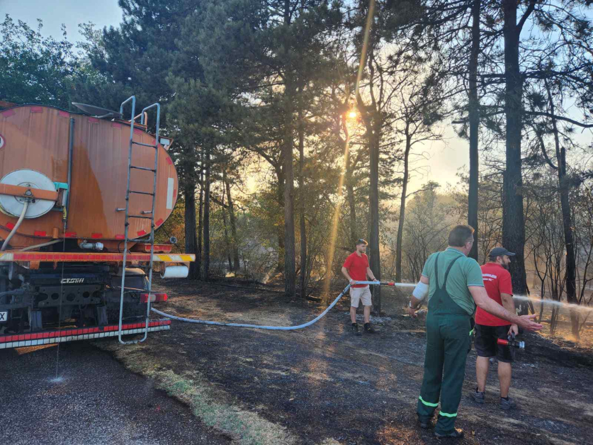 В момента с гръбни пръскачки огнеборци и доброволци обливат обгорените дънери.