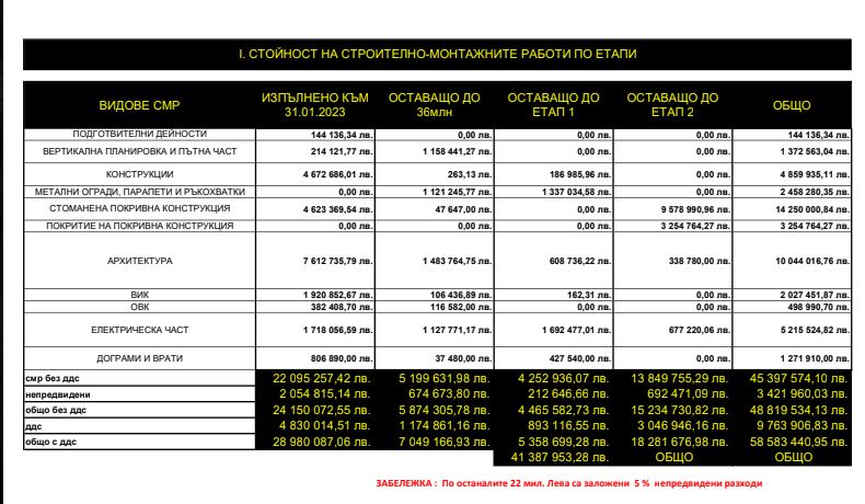 Към сегашния миг имаме обезпечени 36 млн. лева за СМР (25 млн. лева от страната и 11 млн. лева от заема от общината), крайната сума за завършването на стадиона е 58,5 млн. лева или нужни са още 22,5 млн. лева Кметът ще предложи на съветниците да одобрят тази сума, нужна за дотъкмяване на целия план, разпределена в три бюджетни години.