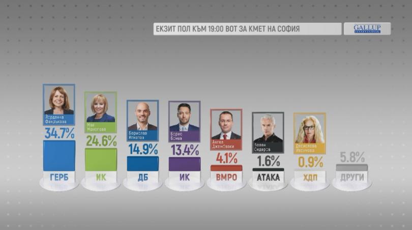 Екзитпол Галъп към 19.00 часа: Балотаж за кмет на София
