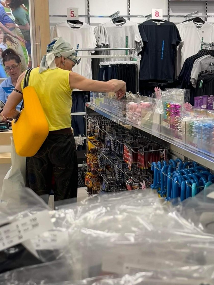 Сакскобургготска бе издокараната с жълт потник и чанта, необятни панталони, забрадка на главата и слънчеви очила, които сваляше понякога, когато гледаше етикетите на продуктите.