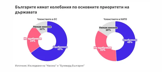 49% споделят, че утвърждават участието на България в НАТО - повече от хората, дали отговор негативно (35%). Високото равнище на поддръжка за отбранителния съюз прави усещане на фона на продължаващата втора година военна инвазия на Русия в Украйна.