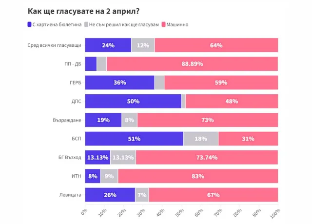 24% споделят, че имат желание да гласоподават с хартиена бюлетина на 2 април, до момента в който 64% избират да го създадат с машина.