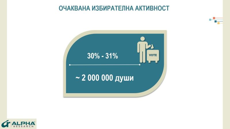 На старта на акцията се обрисуват 7 партии и обединения с капацитет за наличие в новия парламент. Още една или две политически сили могат да акумулират потребен избор, който в забележителна степен ще пристигна не от привличането на нови гласоподаватели, колкото от периферията на актуалните „ огромни “ политически сили, настояват още от Алфа рисърч.