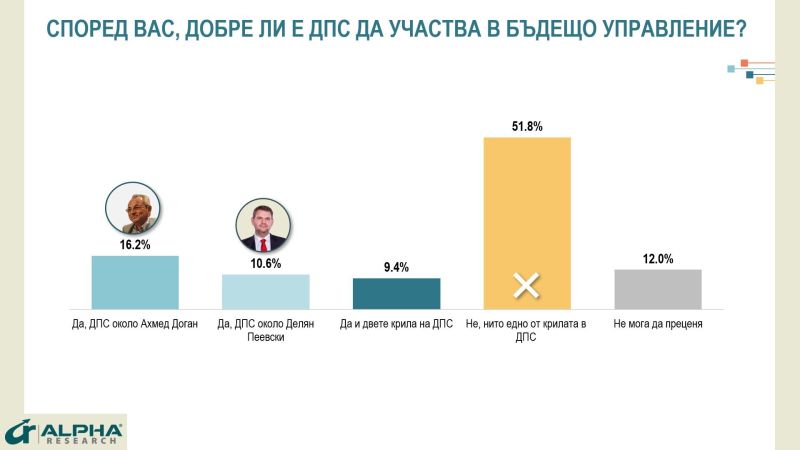 Същевременно, процесите в Движение за права и свободи не способстват за изчистване на облика и приемливостта им като участници в ръководството на нито една от двете фракции. Въпреки желанието на хората за съставяне на необятна коалиция в идващия парламент, във връзка с „ ДПС-тата “, мненията са много сериозни. 51.8% считат, че нито едно от двете крила не би трябвало да взе участие в бъдещо ръководство. 16.2% отдават това право на фракцията „ Доган “, 10.6% - на фракцията „ Пеевски “. Едва 9% са склонни да позволен спокойно общуване сред двете крила в едно бъдещо ръководство.