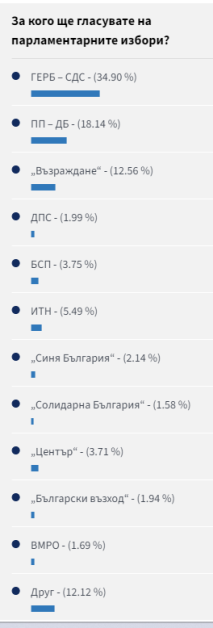 Веднага след групировката с водач Бойко Борисов, се подрежда „ Продължаваме Промяната – Демократична България “ с 18,14%, или съвсем двойно по-малко от първото място. Трети нашите читатели са сложили „ Възраждане “ с 12,56%. Изненадващо четвърти са „ ИТН “ с 5,49%.