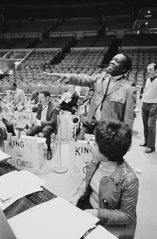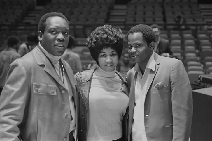 Отляво надясно - саксофонистът Кинг Къртис (1934 - 1971), певицата Арета Франклин (1942 - 2018) и музикантът Джо Текс (1933 - 1982) по време на подготовки за шоуто Soul Together в Медисън Скуеър Гардън, Ню Йорк, 28 юни 1968 година Приходите от шоуто са отишли в Мемориалния фонд на Мартин Лутър Кинг младши.