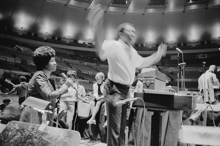 Арета Франклин (1942 - 2018) и саксофонистът Кинг Къртис (1934 - 1971, прав) по време на подготовки за шоуто Soul Together в Медисън Скуеър Гардън, Ню Йорк, 28 юни 1968 година Приходите от шоуто са отишли в Мемориалния фонд на Мартин Лутър Кинг младши.