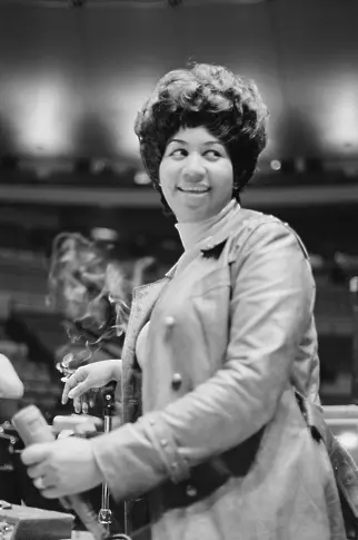 Арета Франклин (1942 - 2018) по време на подготовки за шоуто Soul Together в Медисън Скуеър Гардън, Ню Йорк, 28 юни 1968 година Приходите от шоуто са отишли в Мемориалния фонд на Мартин Лутър Кинг младши.